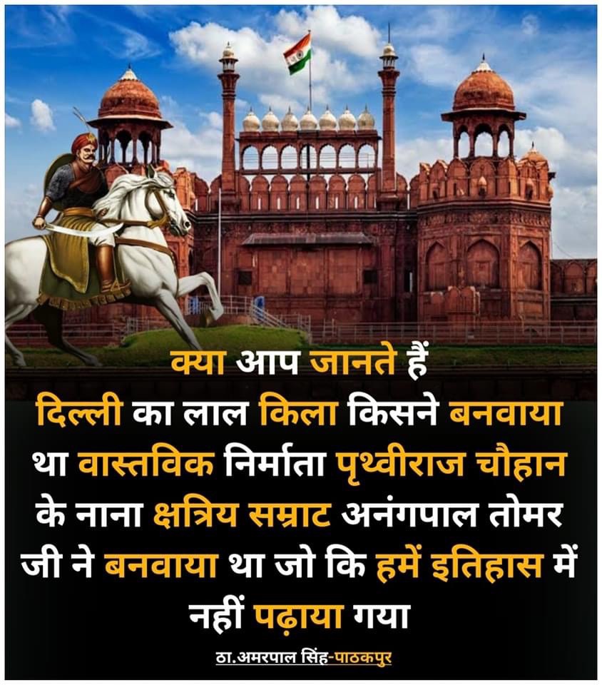 दिल्लीकेसंस्थापकतोमरवंश के 10 वी शदी के 16 वे राजा #क्षत्रियसम्राटअनंगपाल_तोमर द्वितीय महाप्रतापी राजा का योगदान, उनकी भूमिका और चरित्र इतिहास में दबा रह गया। न जाने क्यों ? पद्मविभूषण से अलंकृत पुरातत्वशास्त्री प्रो. बृजबासी लाल ने इस पर काफी शोध किया है, पुस्तक भी लिखी है। लेकिन इंद्रप्रस्थ के आंचल में ढिल्लिकापुरी बसी, फली-फूली और … Continue reading Red fort was constructed by Anang Pal- Prithviraj’s relative